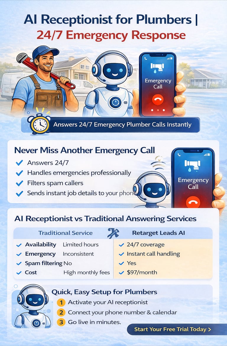An AI receptionist for plumbers works as your always-on front desk. https://retargetlead.com/missed-calls